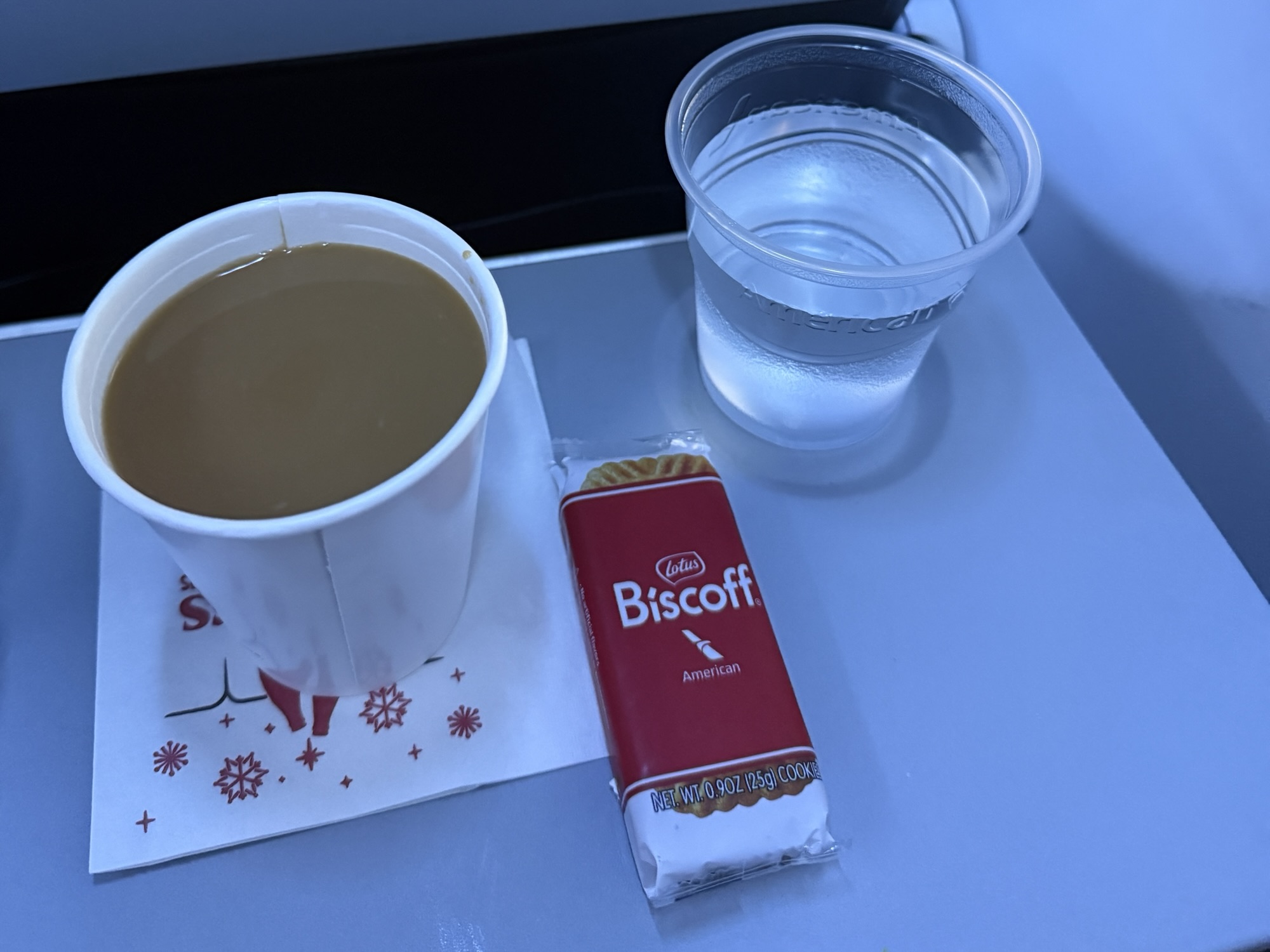 Today’s flight offered a snack service, with Biscoff cookies available. I also ordered a cup of coffee and water.